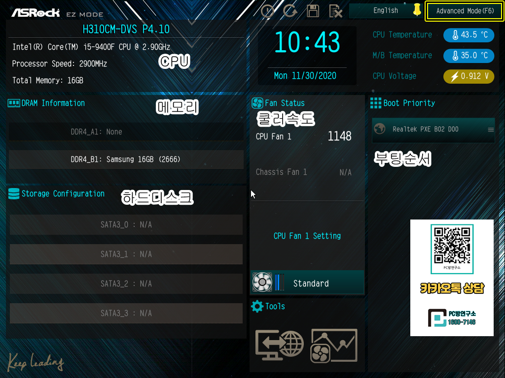 asrock(애즈락) h310cm-dvs 노하드 바이오스 설정
