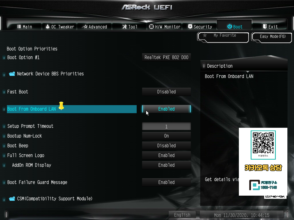 Boot From Onboard LAN 항목을 Enabled(활성화) 해줍니다.