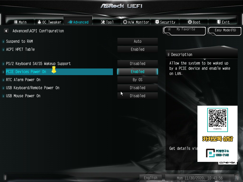 PCIE Devices Power On 항목을 Enabled(활성화) 변경해줍니다.