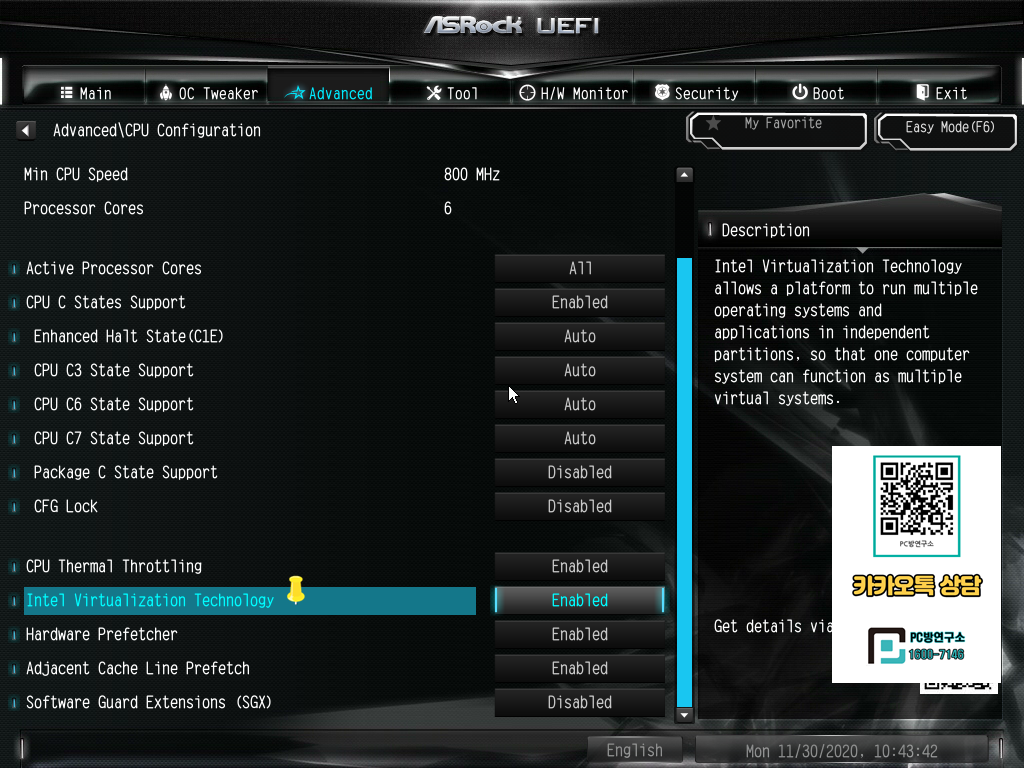Intel Virtualization Technology 항목을 Enabled(활성화)로 변경해줍니다.