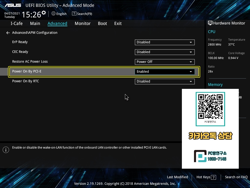 7. Power On By PCI-E 항목을 Enabled로 변경하여줍니다.