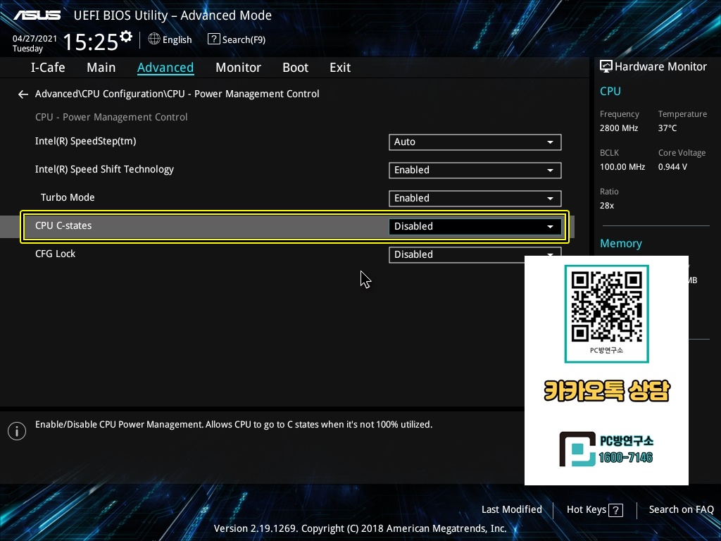 5. 아래에 CPU C-states 항목을 Disable로 변경하여 CPU 절전 항목을 꺼줍니다.