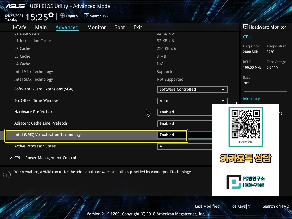 3. 아래로 내리면 Intel (VMX) Virtualization Technology 항목을