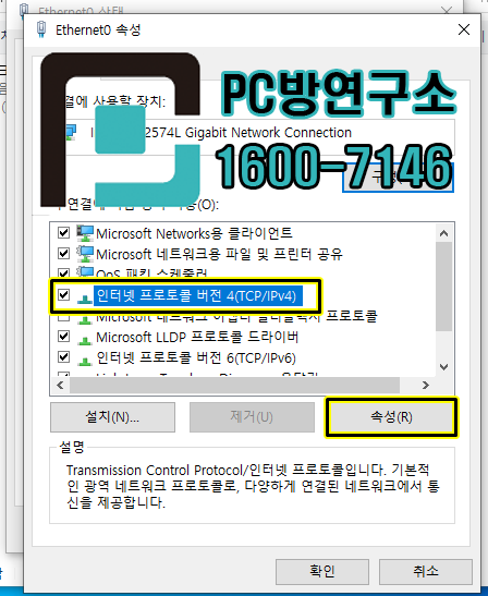 5. 아래 박스 안에 '인터넷 프로토콜 버전 4(TCP/IPv4)' 더블클릭하거나