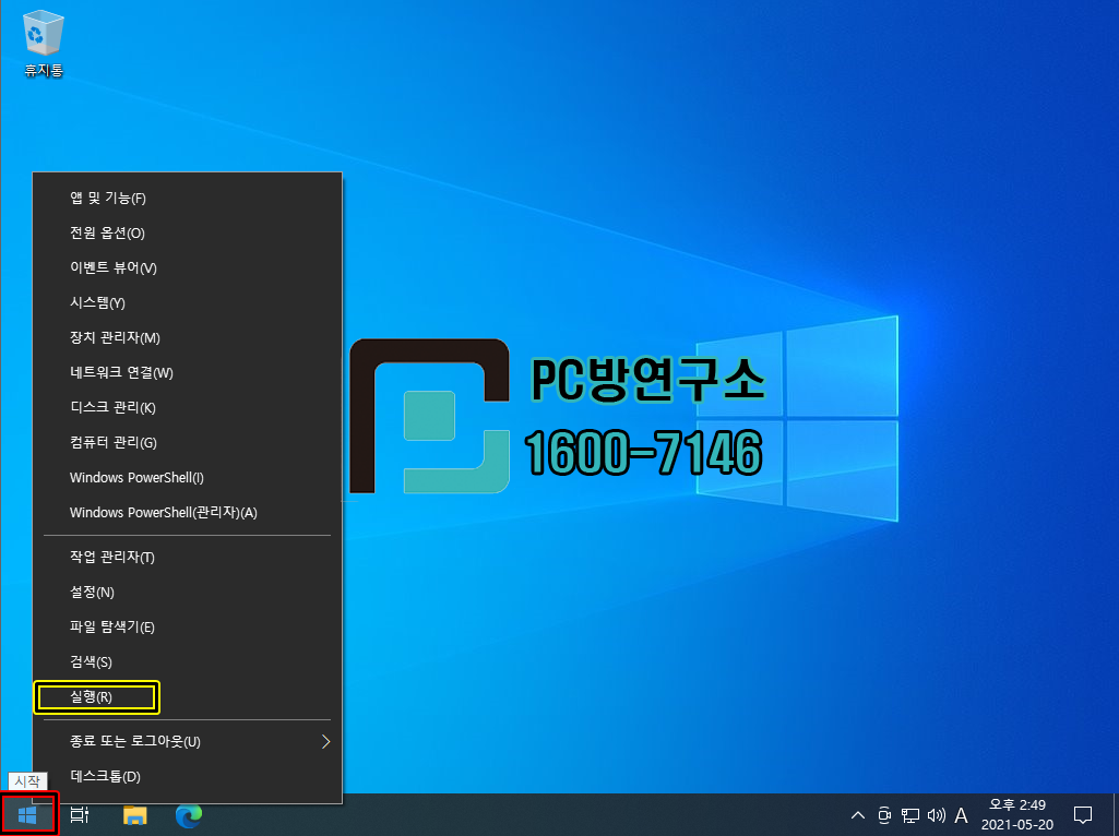 1. 왼쪽 하단에 시작 아이콘을 우클릭을 하게 되면 '실행(R)'을 클릭합니다.