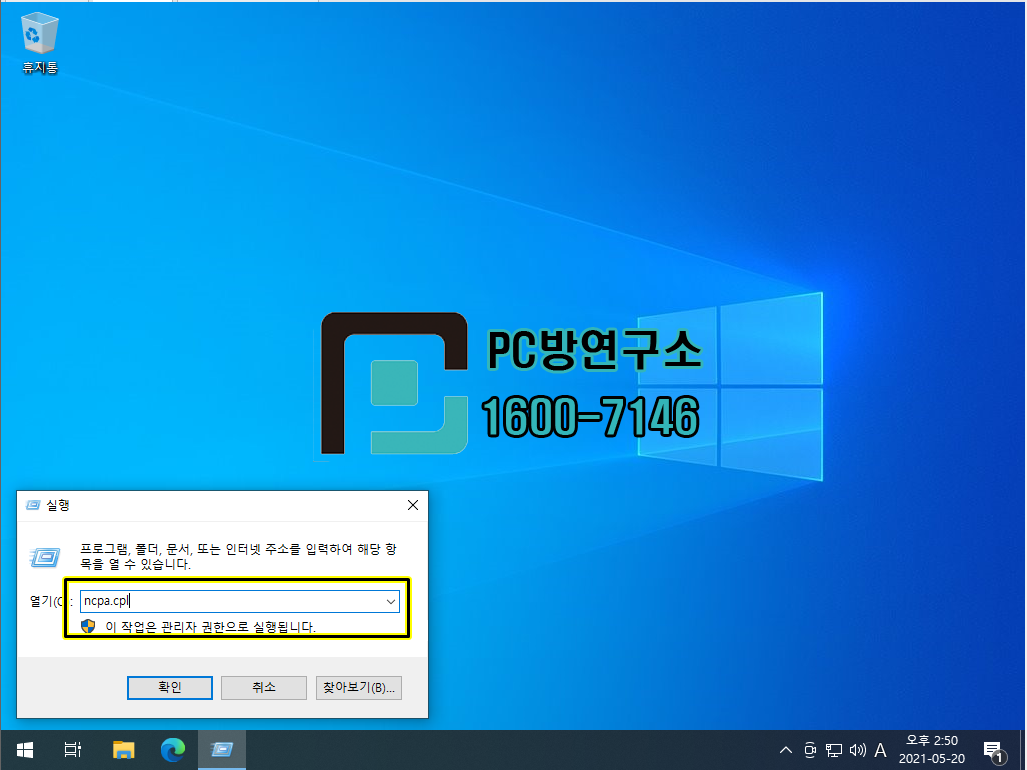 2. 실행창에서 ncpa.cpl 입력하고 확인 혹은 엔터를 쳐줍니다.