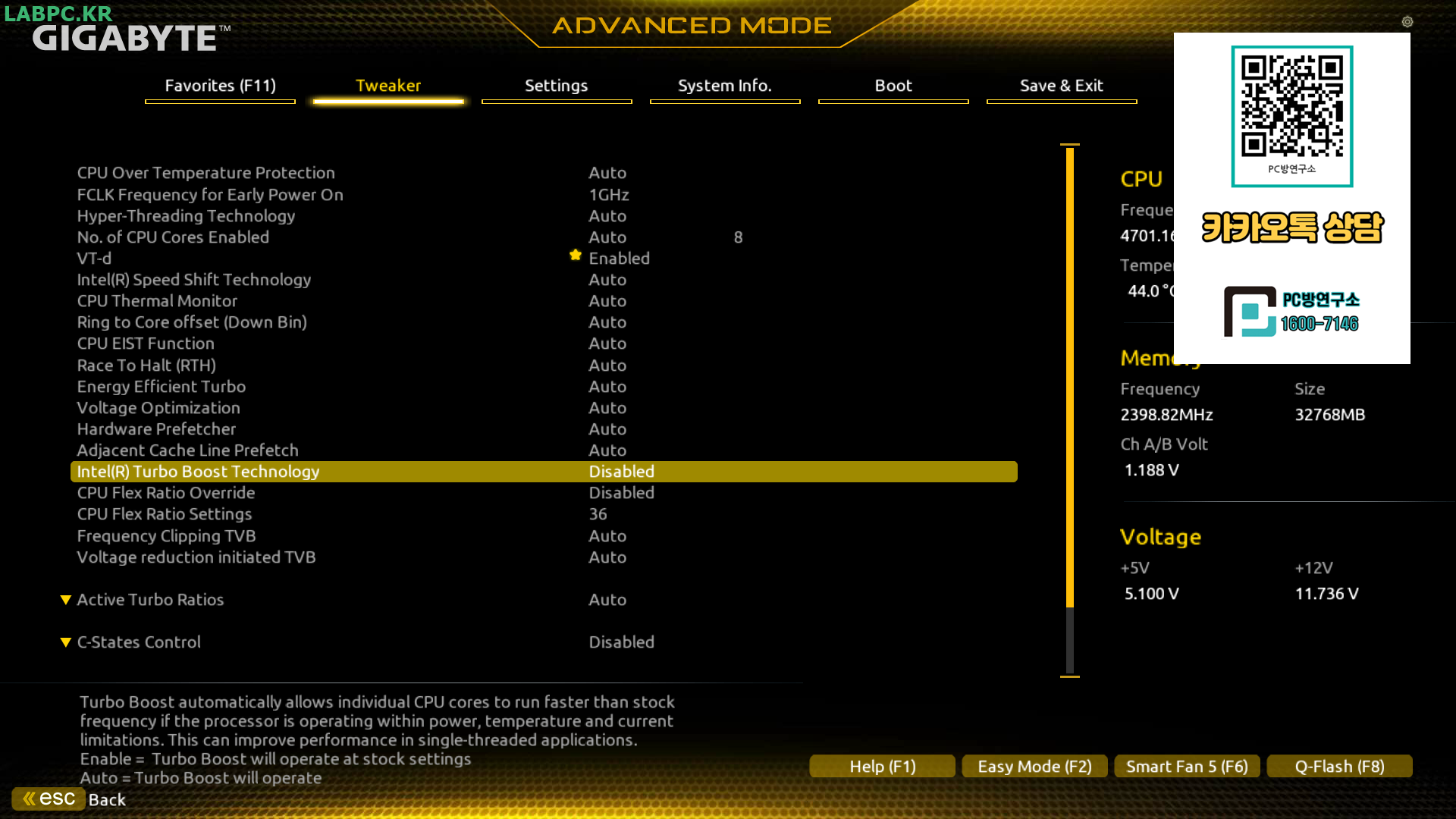Intel(R) Turbo Boost Techology 항목도 Disabled 변경합니다.
