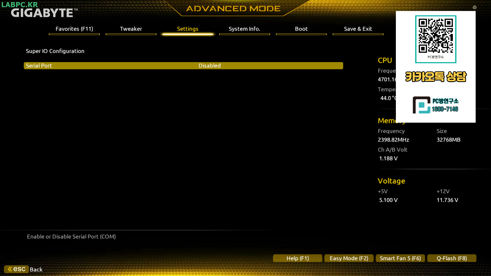 7. Serial Port 항목을 Disabled로 변경합니다.
