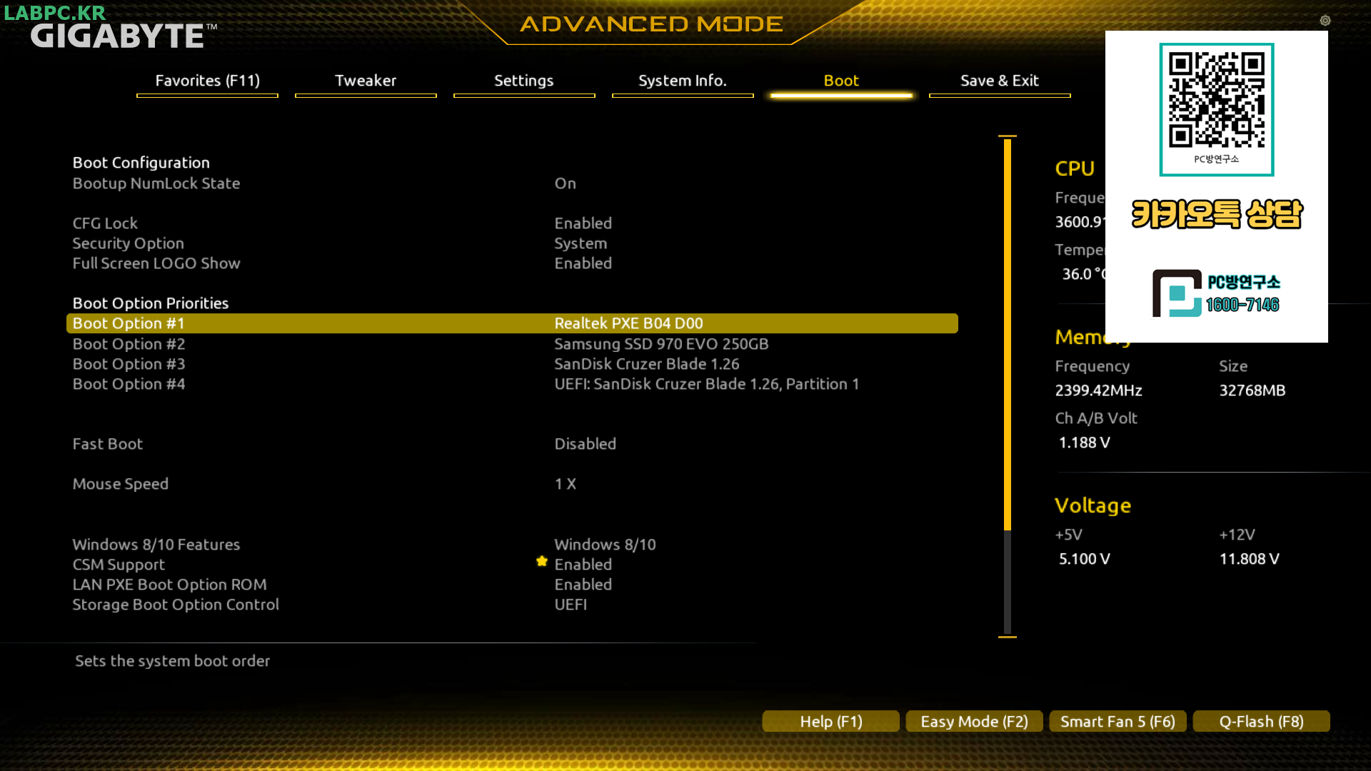1. 컴퓨터 전원은 넣어주고 키보드에 DEL or F2 키를 연타하여