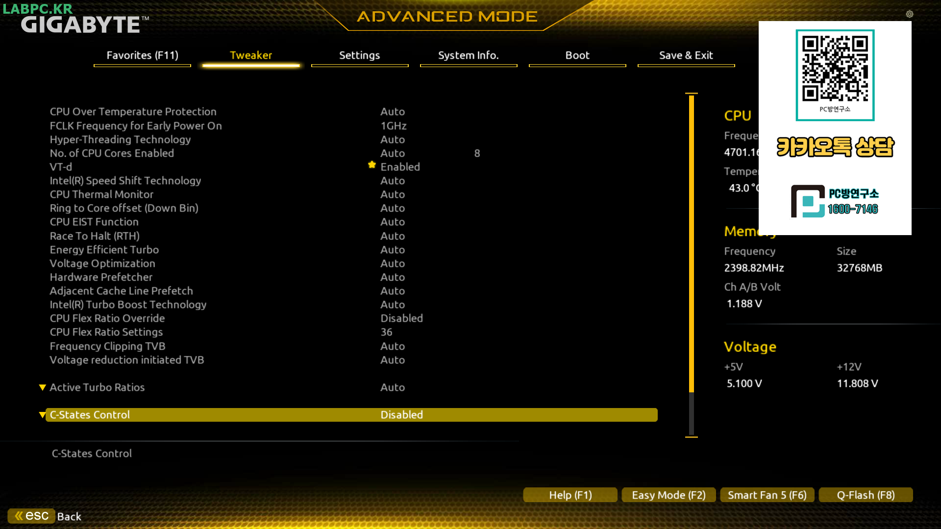 3. 아래에 C-States Control 항목을 Disabled로 변경합니다.