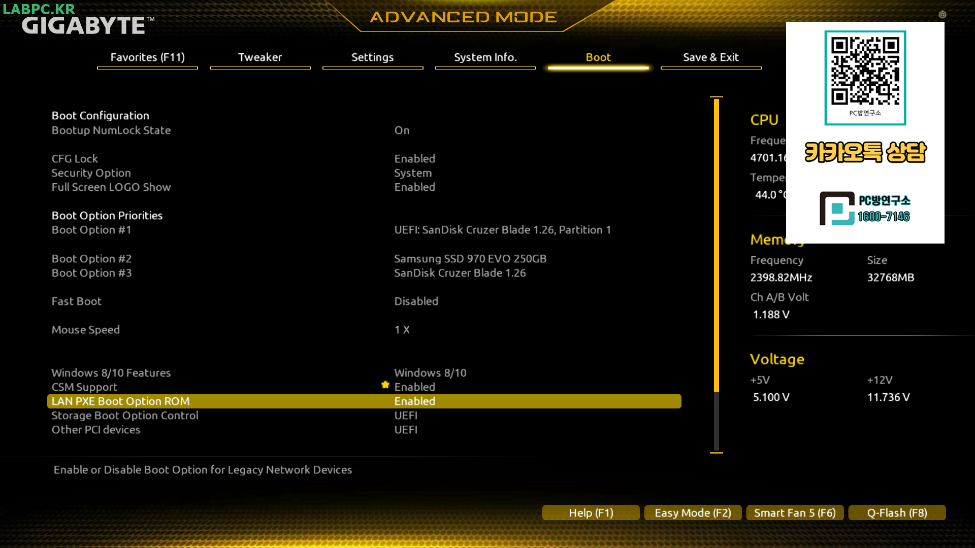 LAN PXE Boot Option ROM 항목을 Enabled로 변경합니다.
