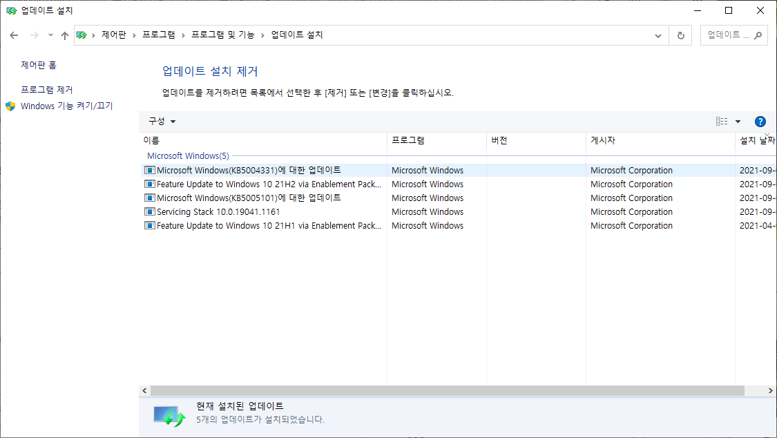 2021년 9월 15일 자 윈도우 업데이트 항목 중에