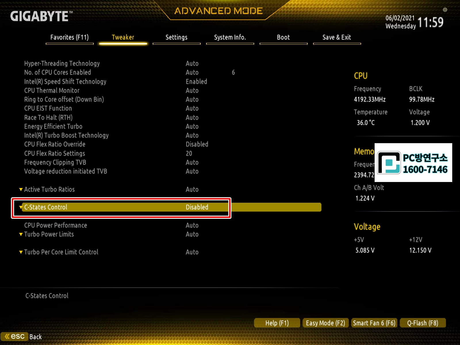 3. C-States Control 항목을 Disabled로 변경합니다.