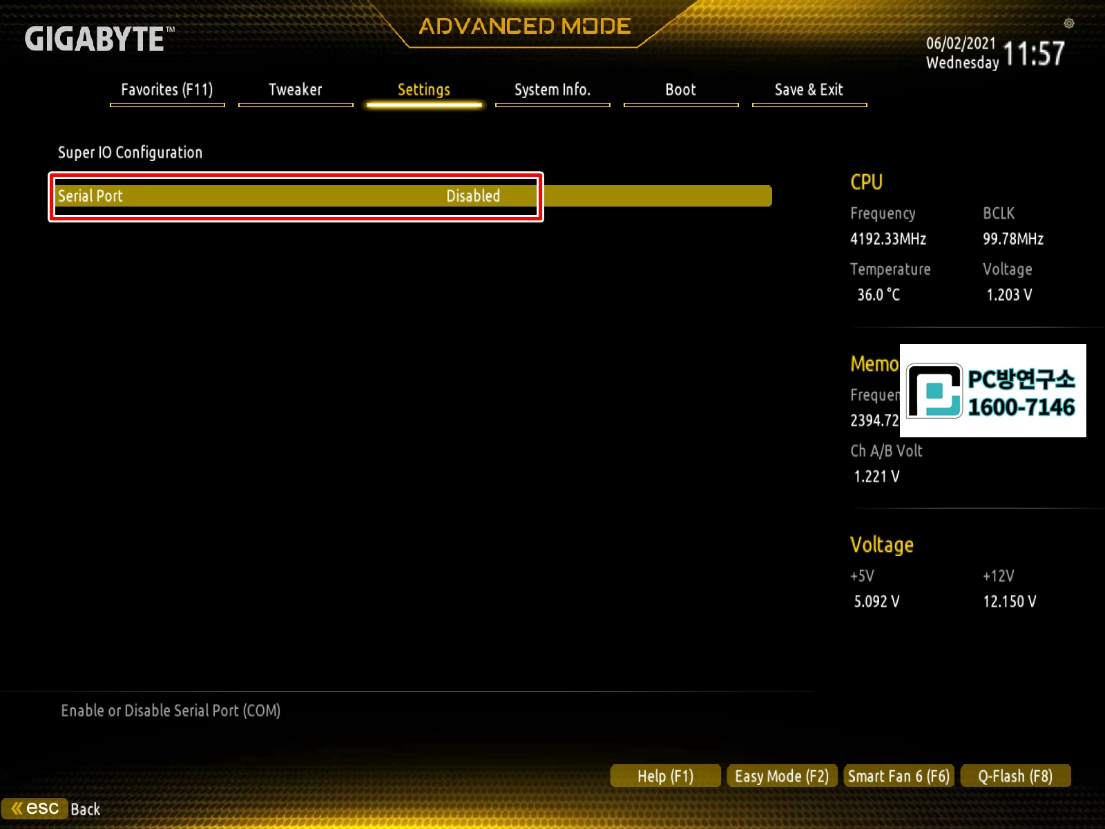 8. Serial Port 항목을 Disabled 변경합니다.
