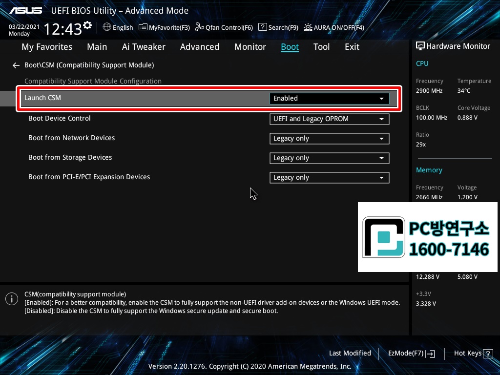 4. Launch CSM 항목을 Enabled로 변경합니다.