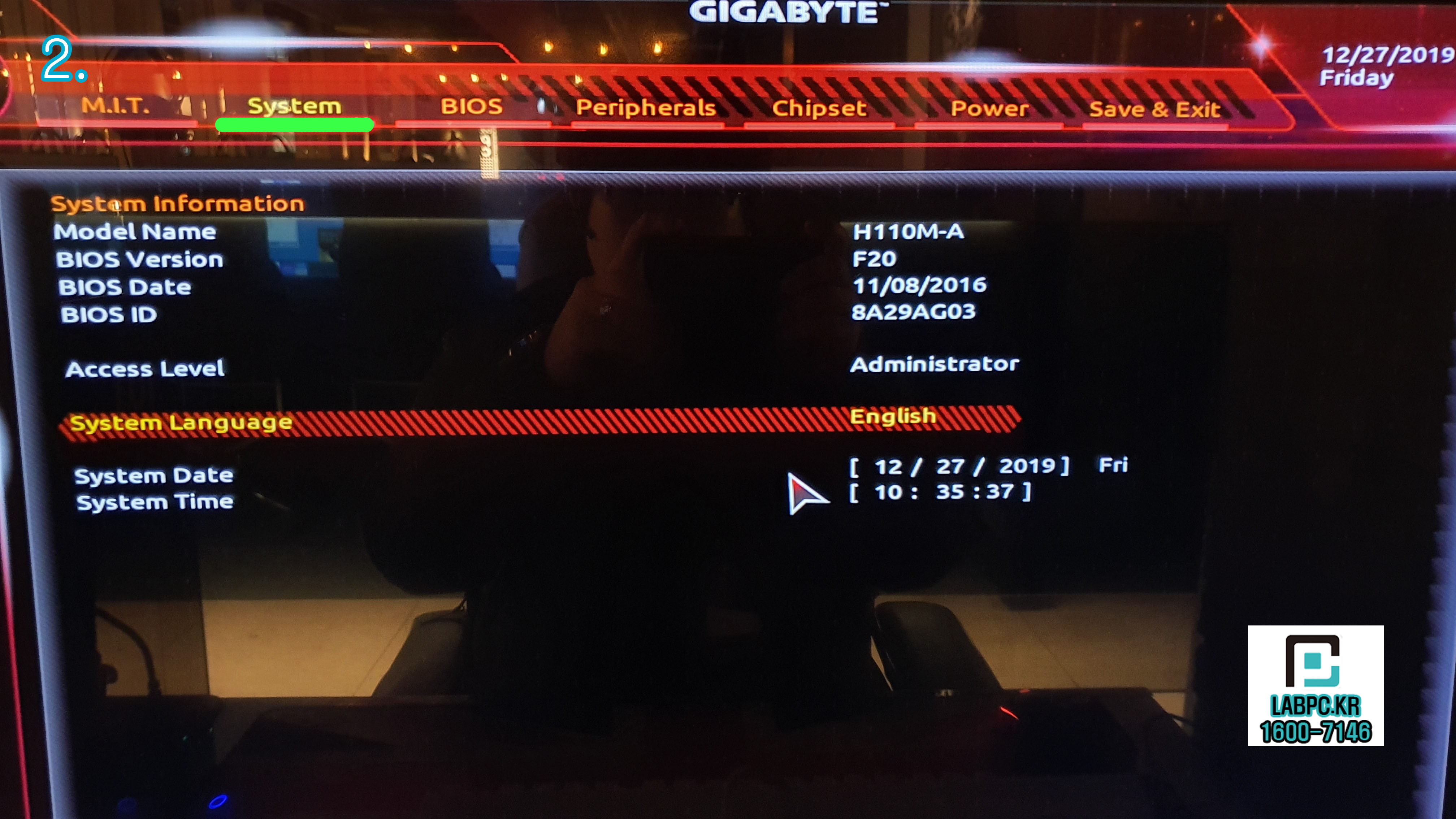 2. 상위 큰 메뉴에 System에는 보드에 모델명 바이오스 버전, 시간, 언어 설정 등을 할 수 있습니다.