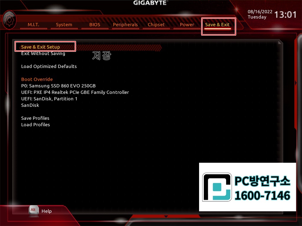상단에 Save & Exit 메뉴에서