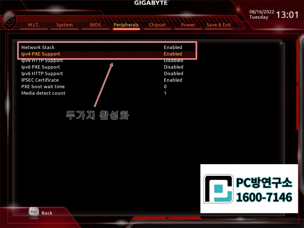 *네트워크 PEX UEFI 항목 필수입니다.