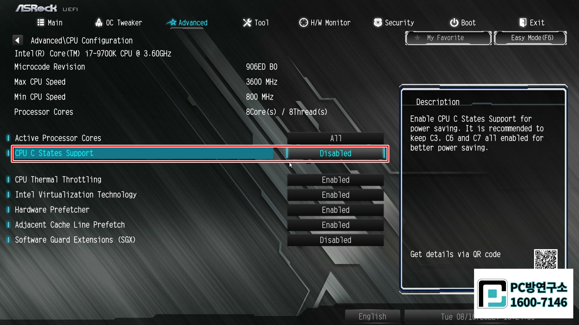 CPU C States Support 항목을 Disabled 해줍니다.