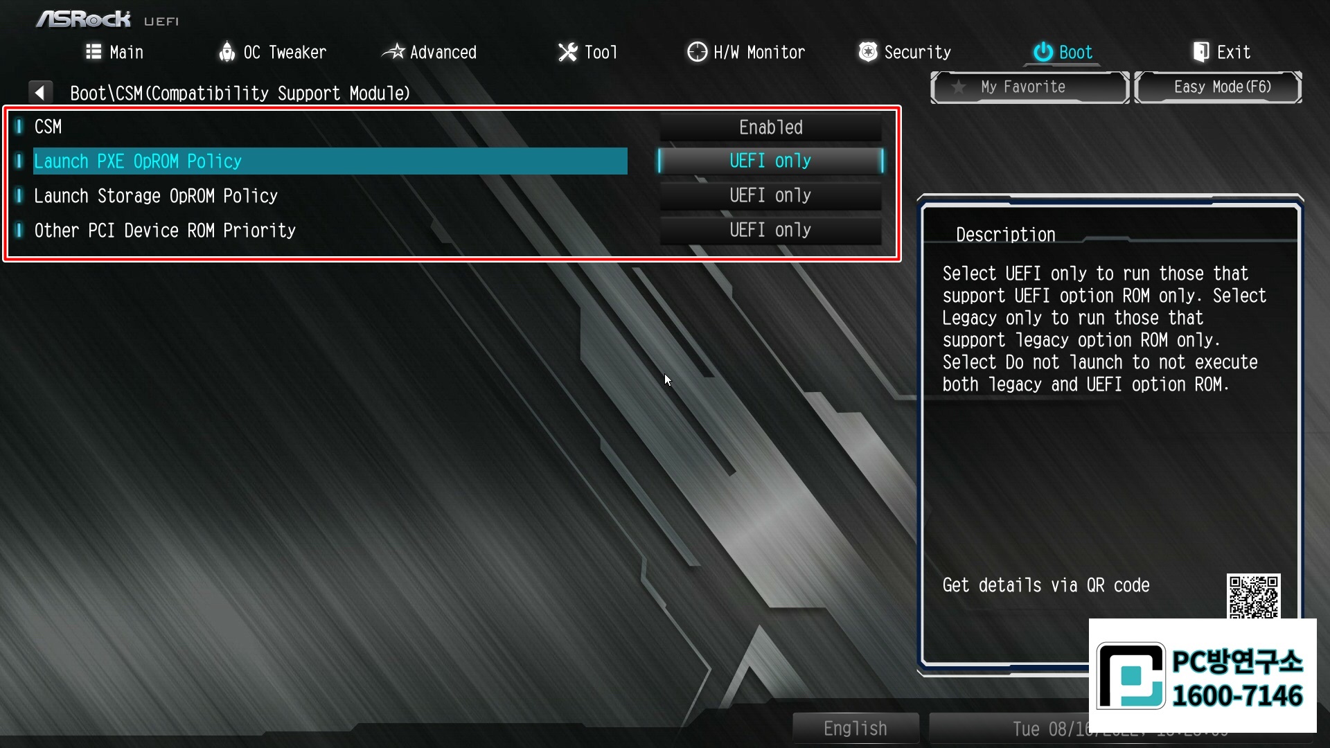 Launch PXE OpRom Policy 항목을 UEFI only로 변경해줍니다.