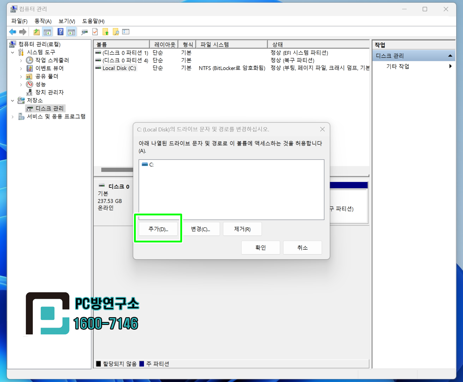 '드라이브 문자 및 경로 변경' 클릭합니다.