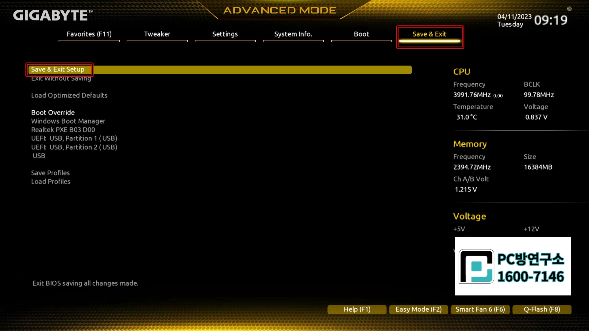 Save & Exit Setup 하시면 재부팅하면서 저장이 됩니다.