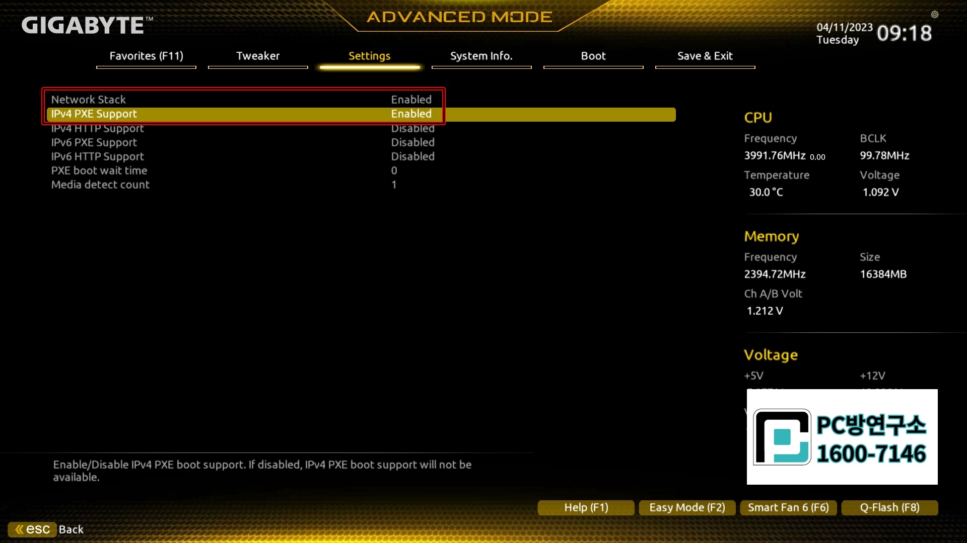IPv4 PXE Support 항목을 Enabled로 변경하면