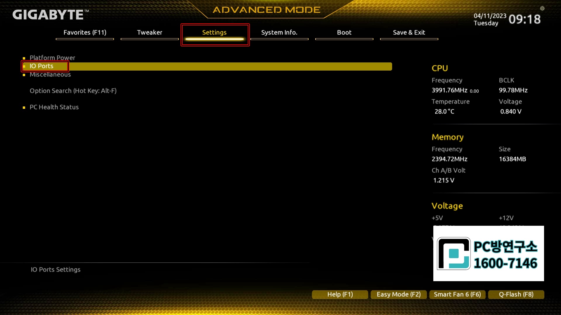 상단에 Settings 항목에서 아래 IO Ports 로 진입합니다.