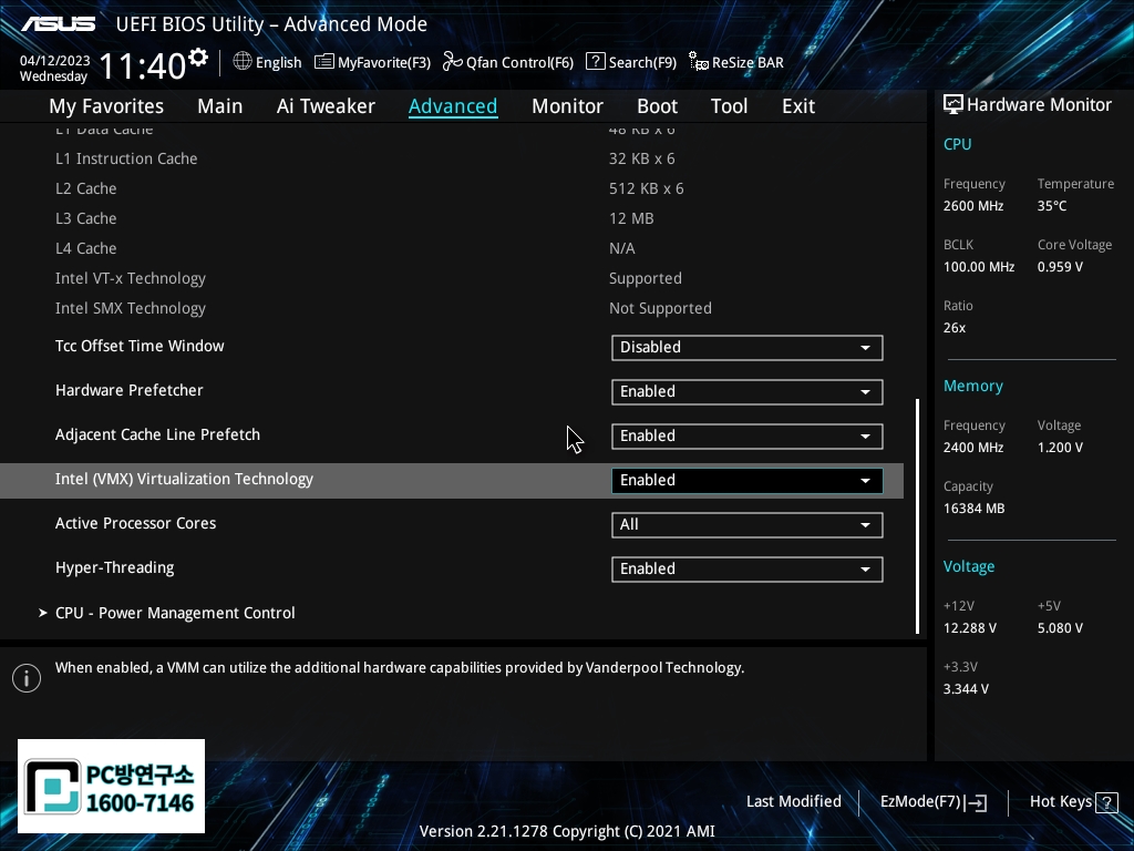 Intel (VMX) Virtualization Technology 항목을