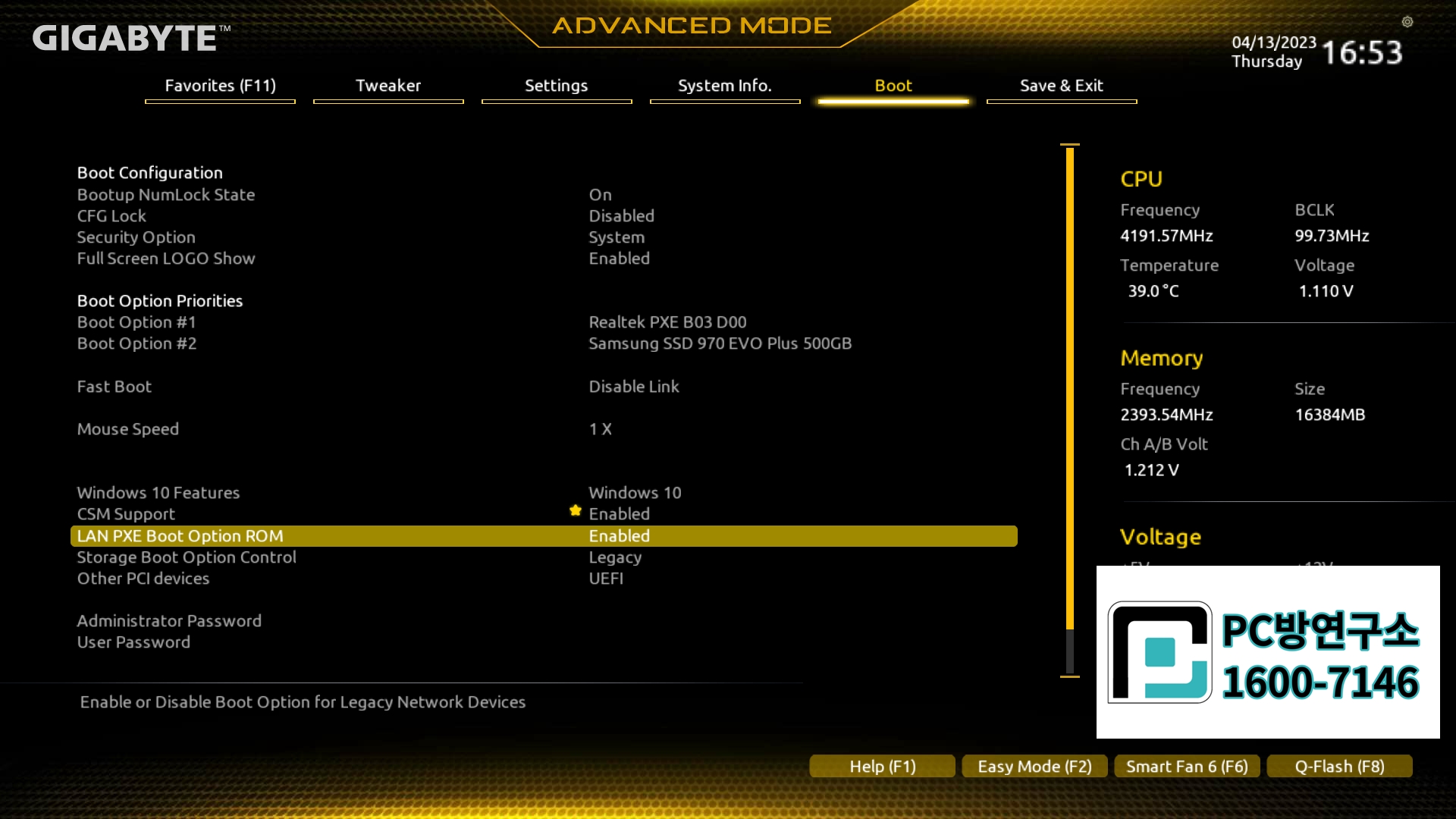 2. PXE 랜부팅 옵션 활성화입니다.