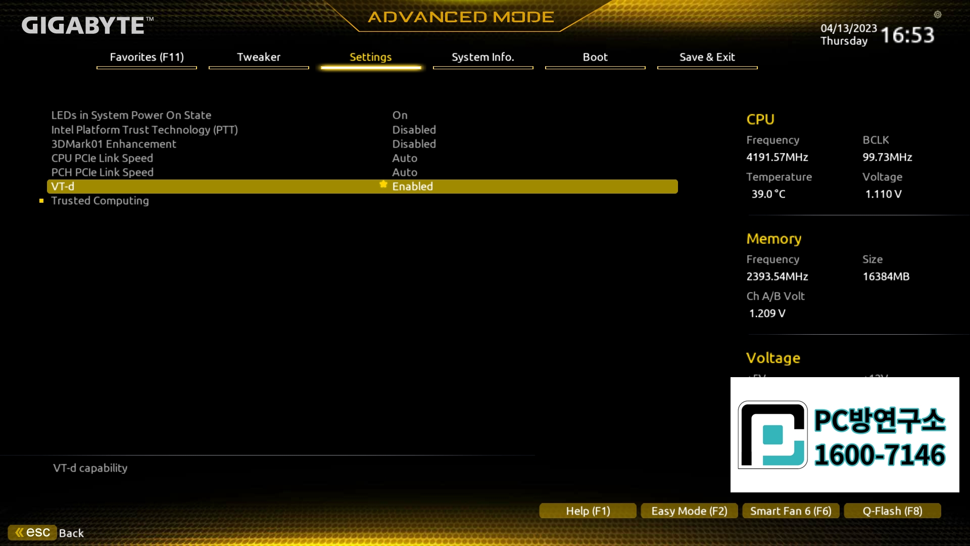 VT-d 항목을 Enabled로 변경해 줍니다.