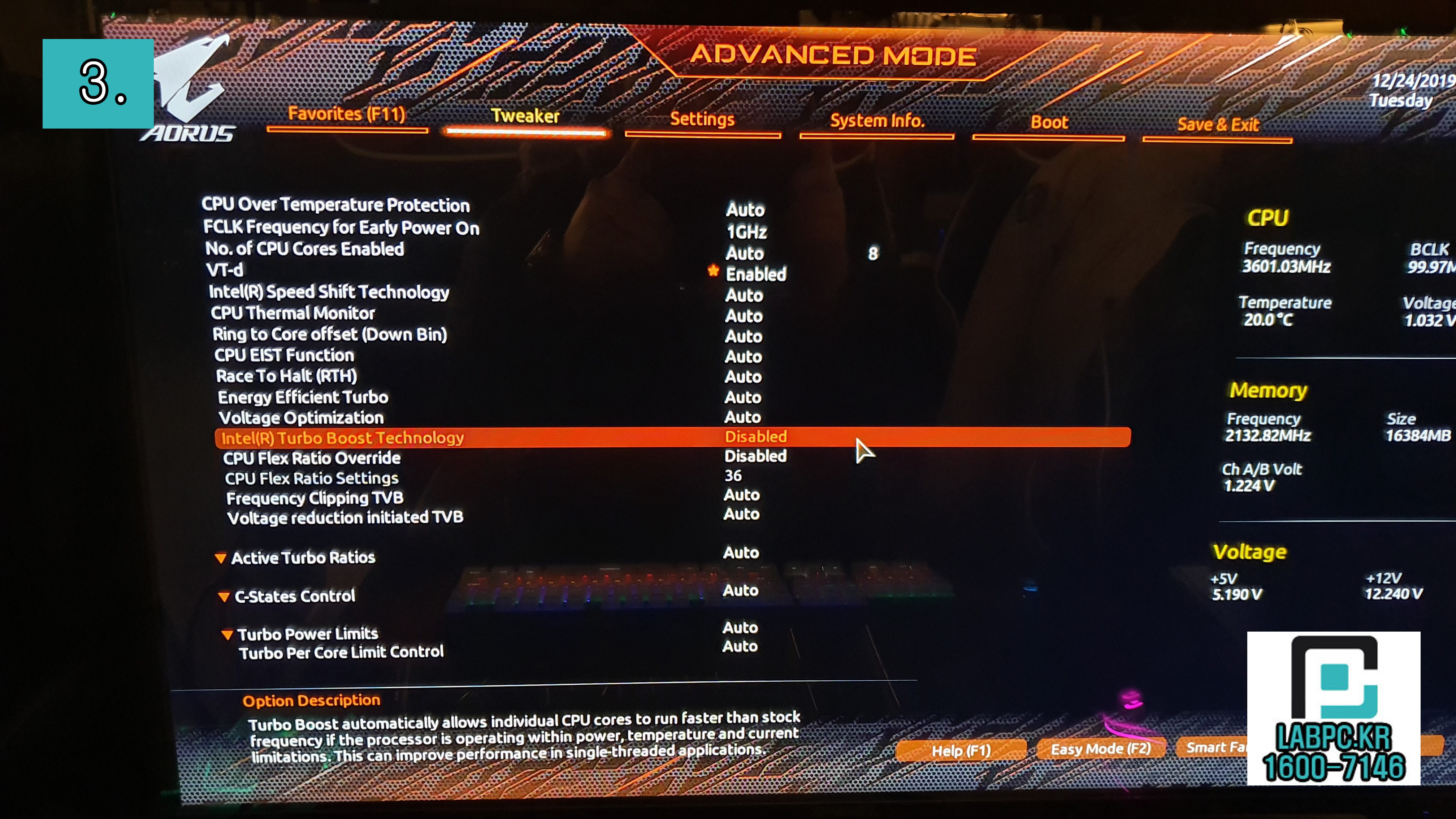 Tweaker > Intel(R) Turbo Boost Technology를 Disabled 해줍니다.