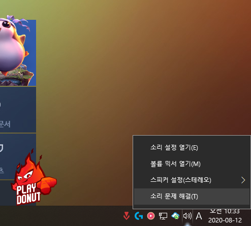 우측하단에 스피커 모양 아이콘을 우클릭하시면 메뉴가 나옵니다.