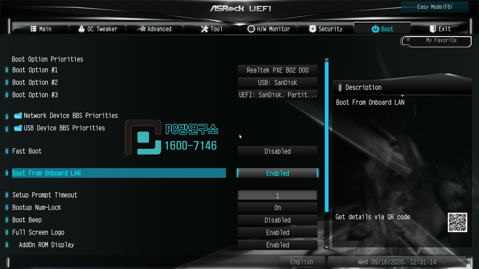 상단에 Boot 메뉴에 아래로 내리시면 Boot From Onboard LAN을 Enabled 변경해줍니다.