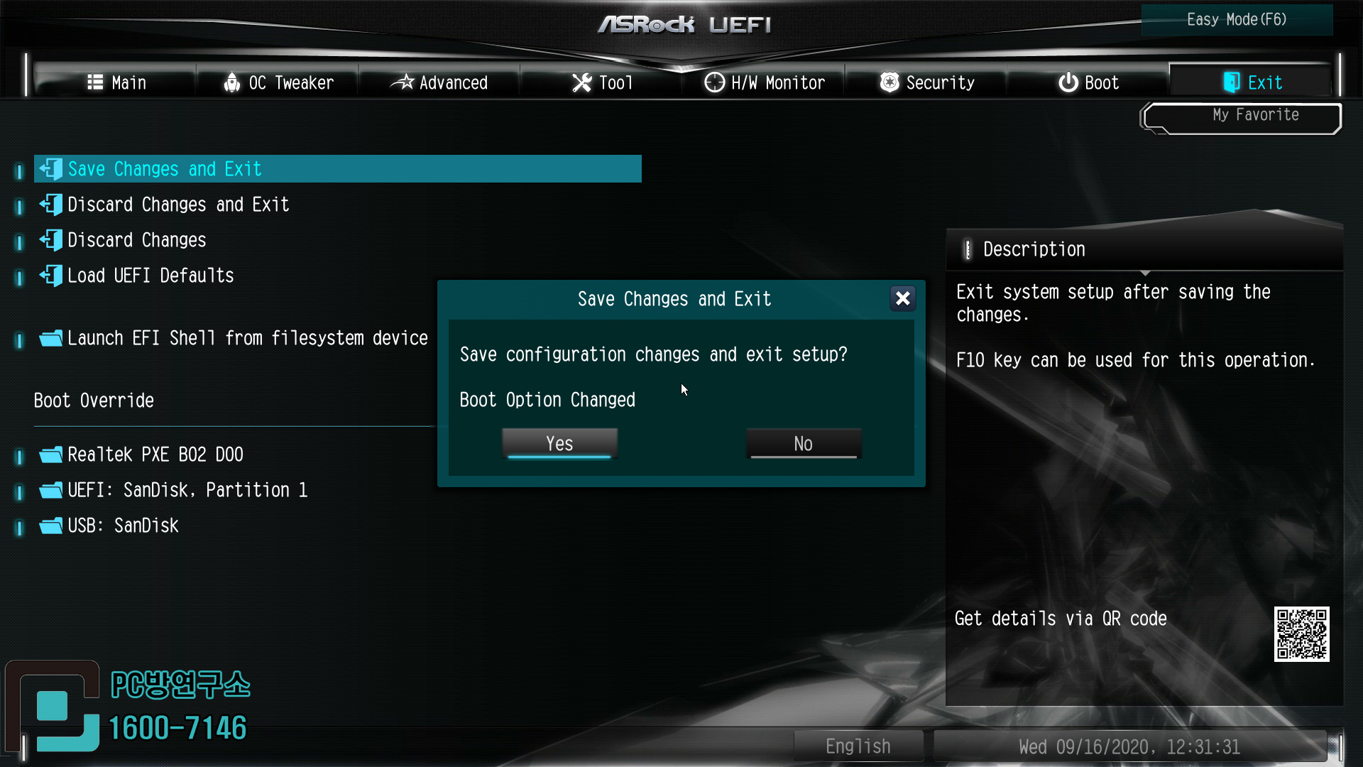 상단에 Exit에 Save Changes And Exit 항목을 엔터 치게 되면