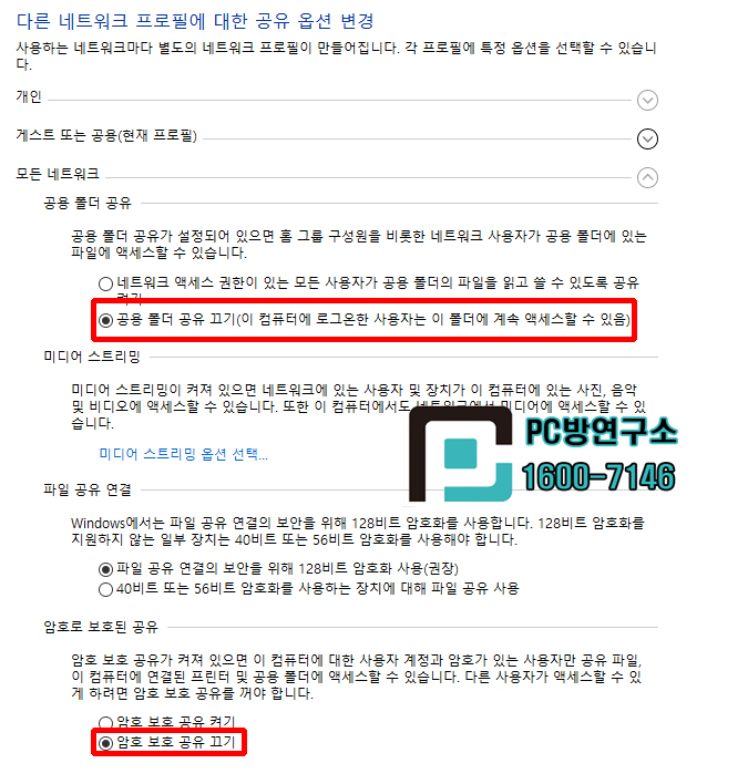 '공유 폴더 공유', '암호로 보호된 공유' 두 가지 메뉴도 끄기로 해주시면 됩니다.