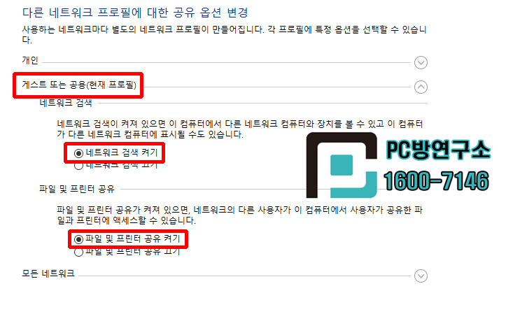 다른 네트워크 프로필에 대한 공유 옵션 변경을 할 수 있는데