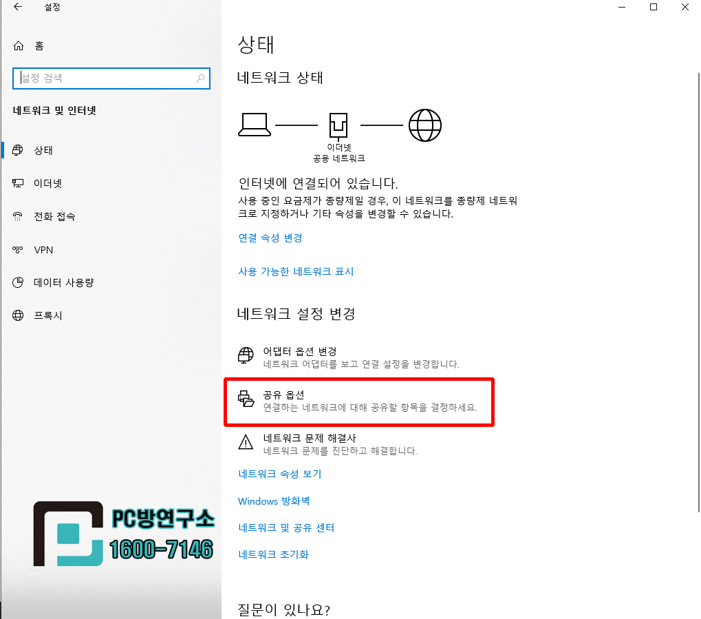 2번째로는 고급 공유 설정을 확인하는 겁니다.