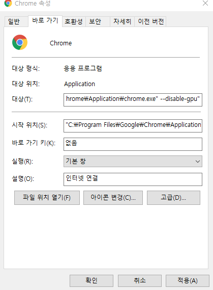 거기에 기존 내용 그대로 두시고 끝에 한 칸 띄워서 --disable-gpu를 넣어줍니다.