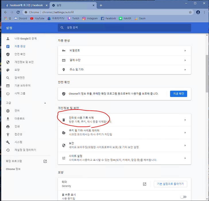 우측에 조금 아래에 '개인정보 및 보안' 탭에 '인터넷 사용 기록 삭제'라고 있습니다.
