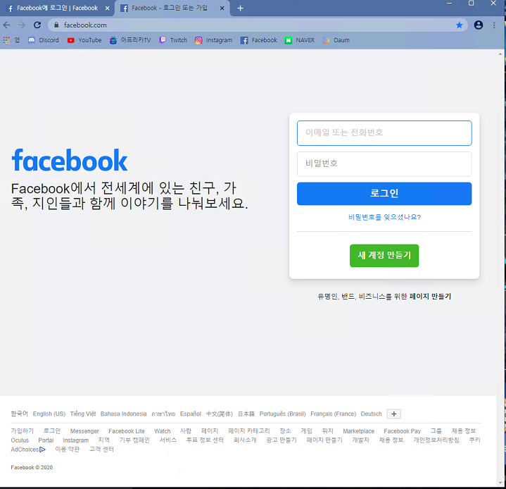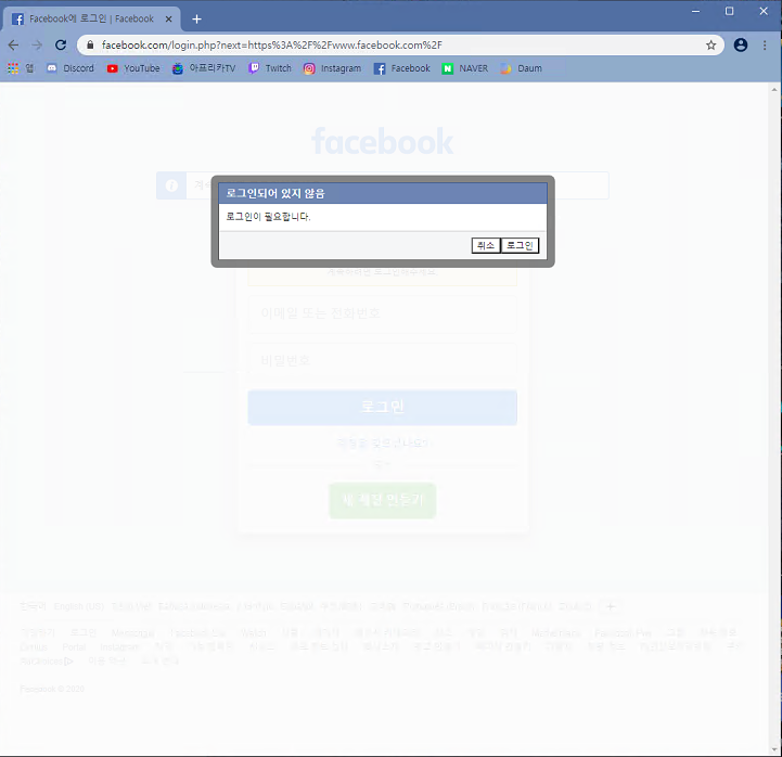 페이스북을 접속했을 때 위와 같이 '로그인되어 있지 않음' 경고가 뜹니다.