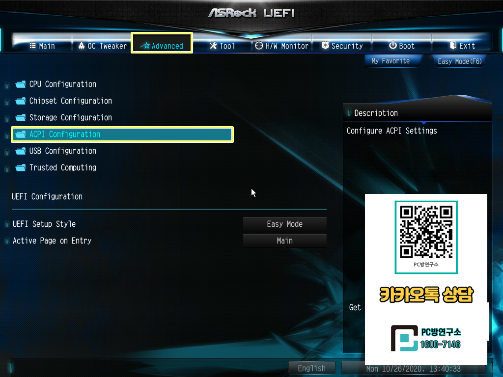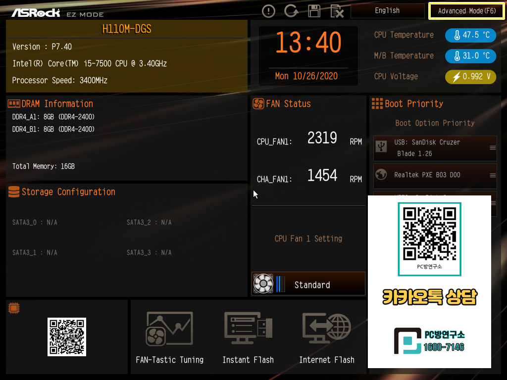 우측 상단에 Advanced Mode(F6) 눌러 진입합니다.
