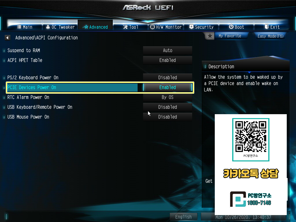 6. PCIE Devices Power On 항목을 Enabled로 변경합니다.