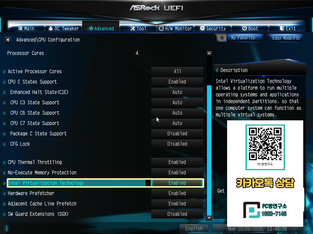 Intel Virtualization Technology 항목을 Enabled로 변경합니다.