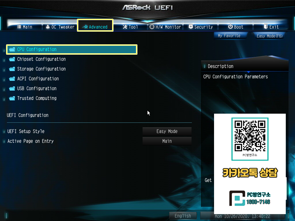 3. 상단에 Advanced Mode에 하단에 CPU Configuration 메뉴로 진입합니다.