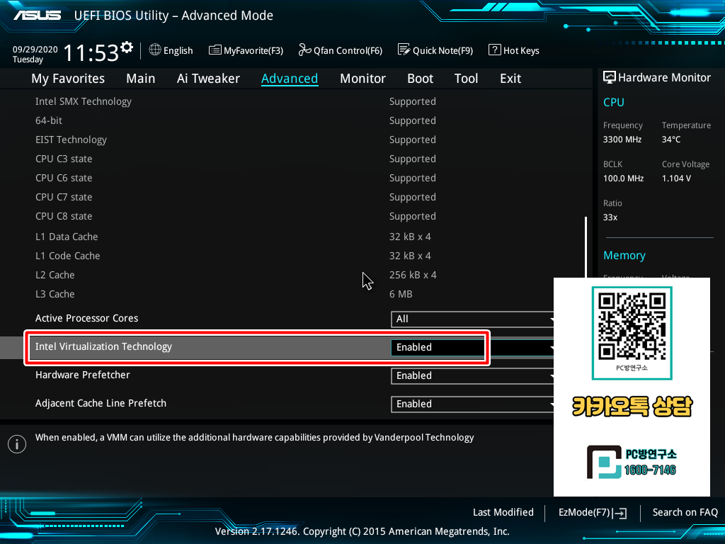 Intel Virtualzation Technology 항목을 Enabled 해줍니다.