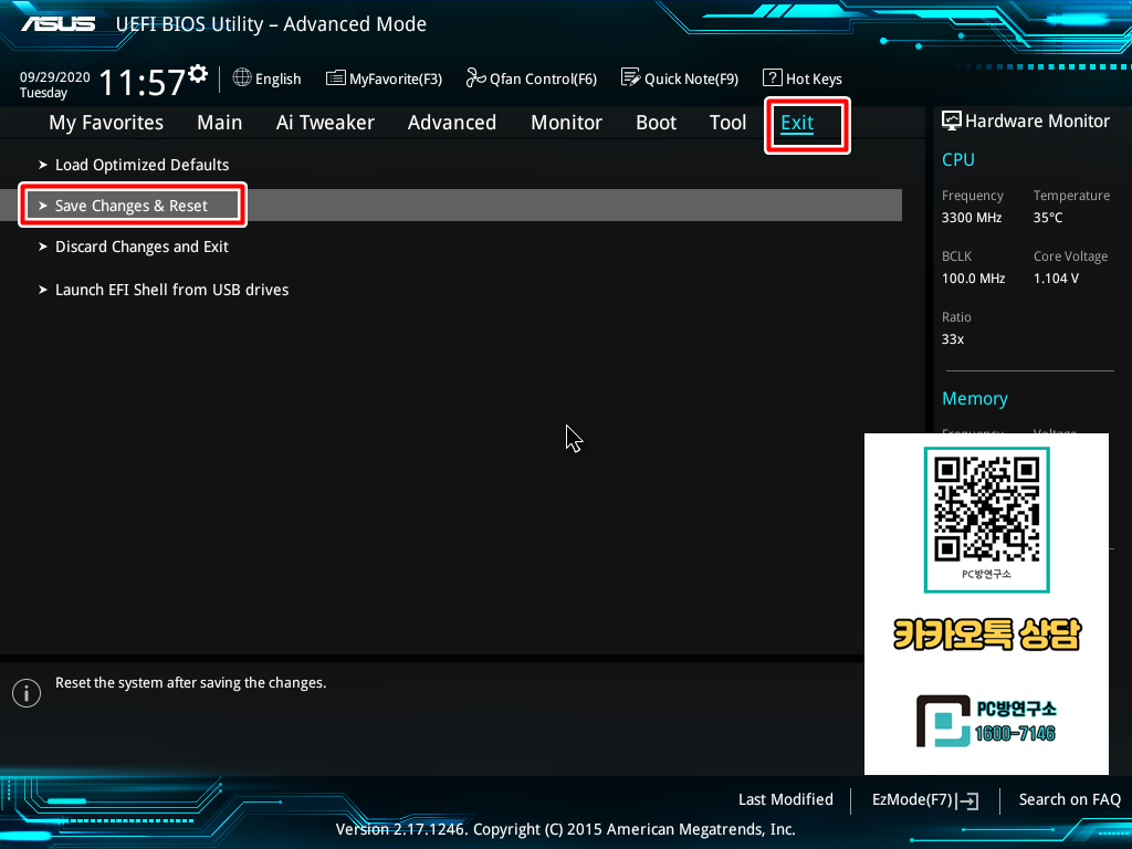 상단에 Exit에서 Save Changes & Reset을 눌러 저장합니다.