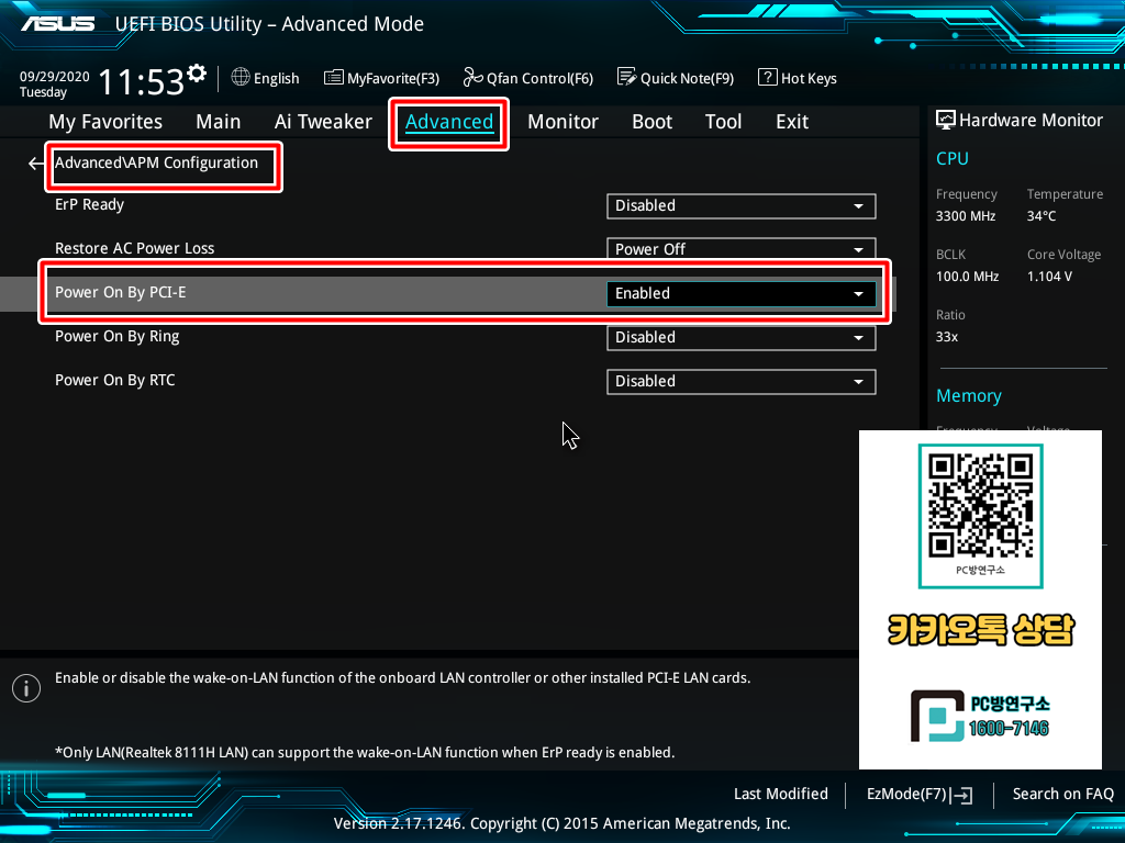 Power On By PCI-E 항목을 Enabled로 변경하여줍니다.