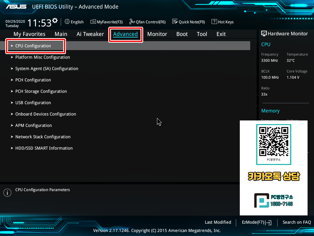 3. 상단 Advanced에서 아래 CPU Configuration 항목으로 진입합니다.