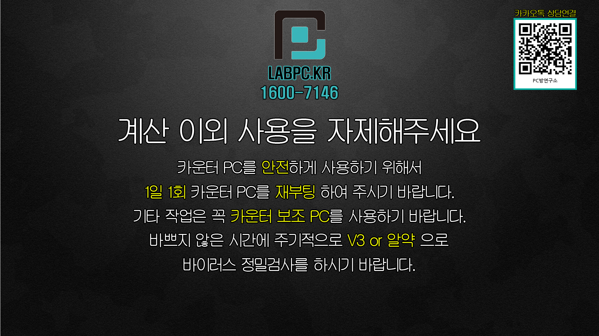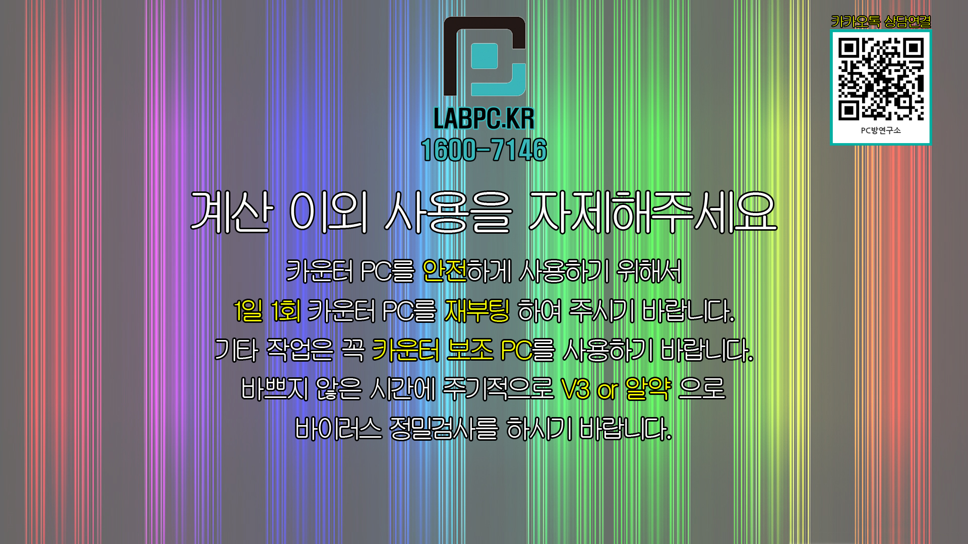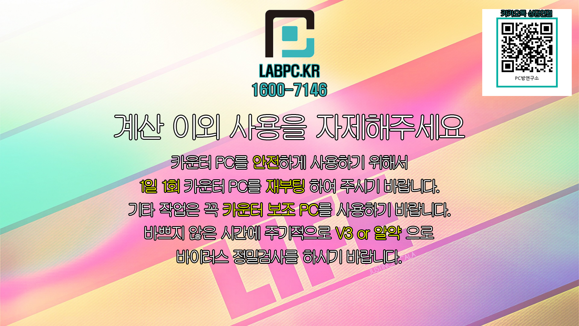 카운터 배경화면 공유합니다.(대표번호, 카카오톡 QR코드 포함) 공지사항 2020. 9. 24. 14:39 계산 외 사용금지 문구와 PC방연구소 대표번호, 카카오톡 연결 QR 코드 표시 해두었습니다. 카운터배경(카톡).zip 6.00MB 다운로드 받으셔서 카운터 배경화면으로 사용하시면 됩니다. 공유하기 게시글 관리 PC방연구소